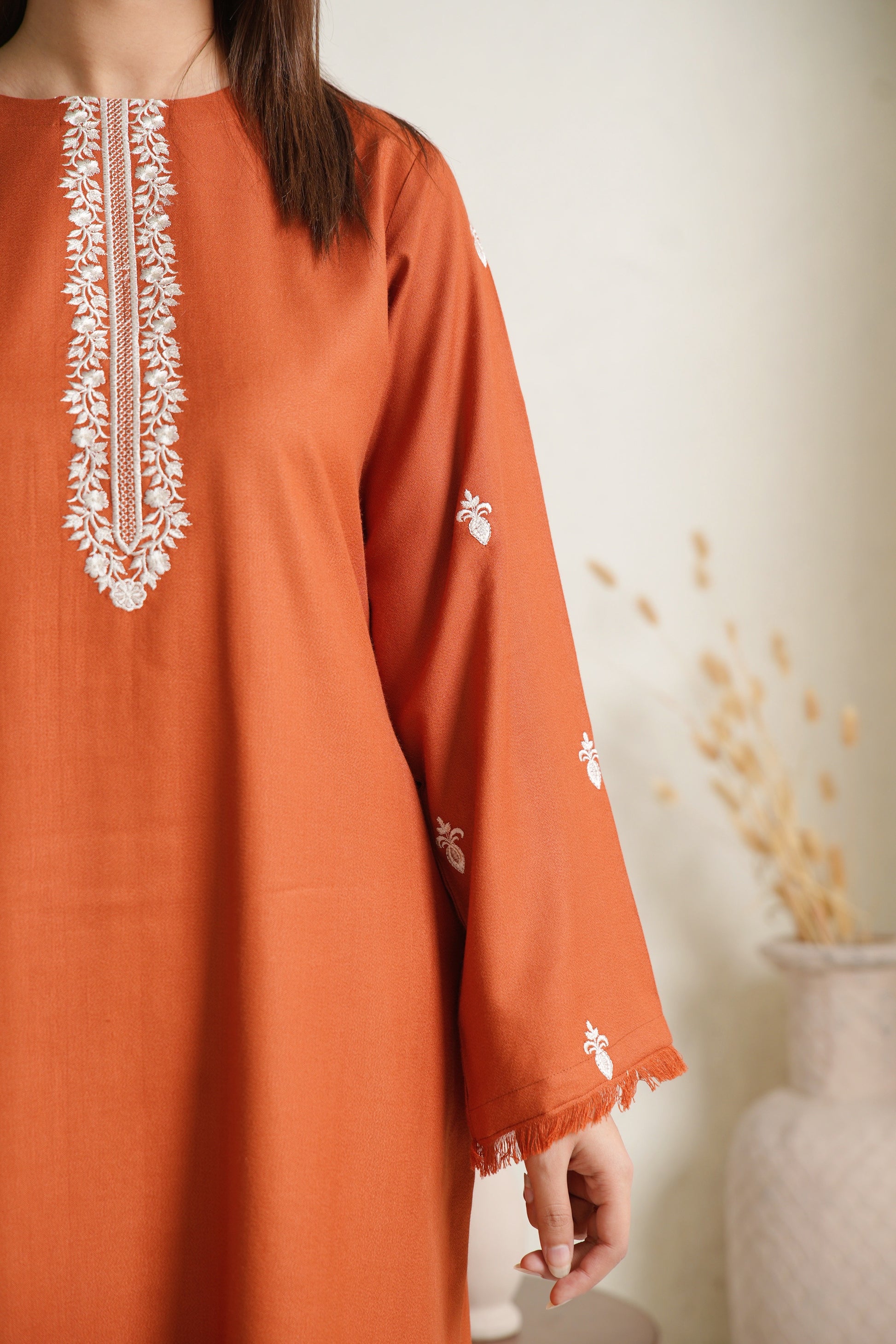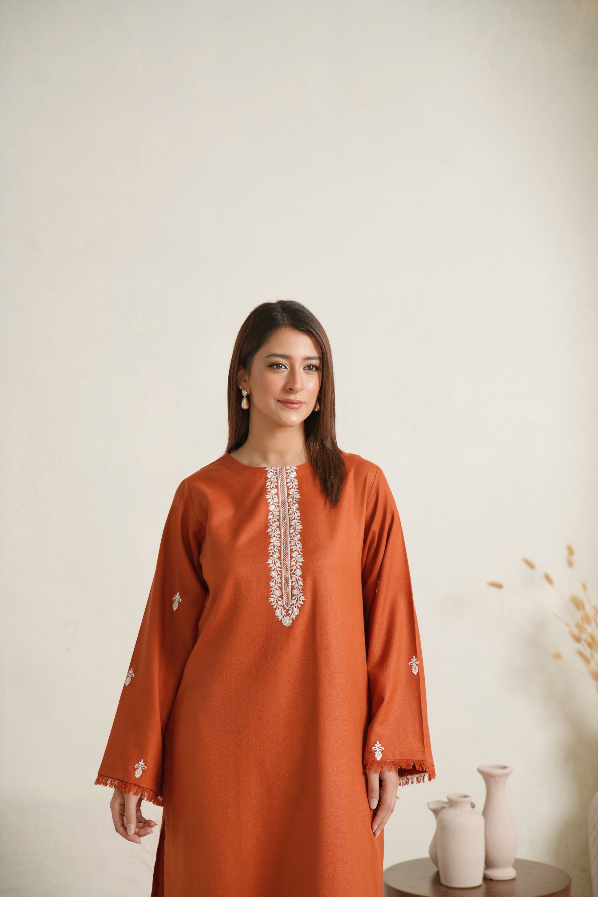 This ensemble in the prettiest shade of rust. The shirt features delicate off-white embroidered neckline along with embroidered sleeves paired with matching loose pants. This look is perfect for winter gatherings