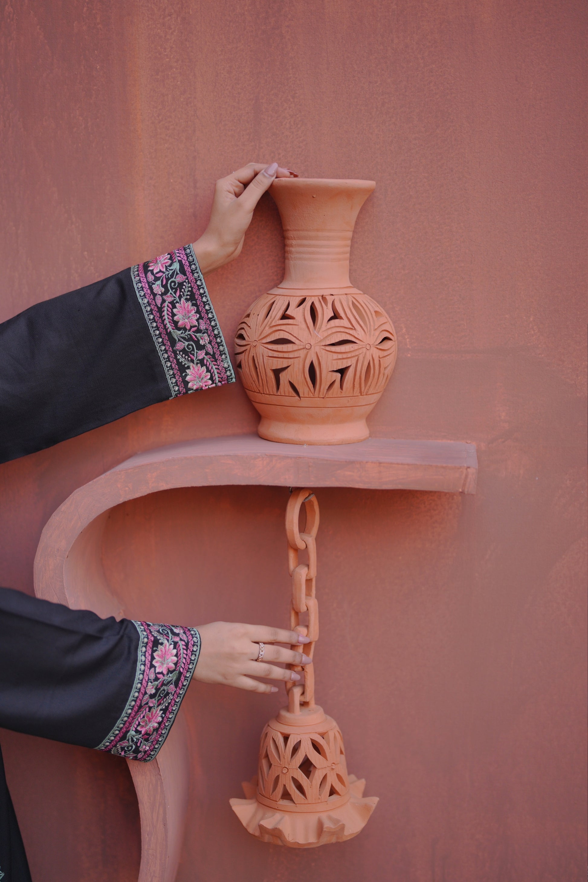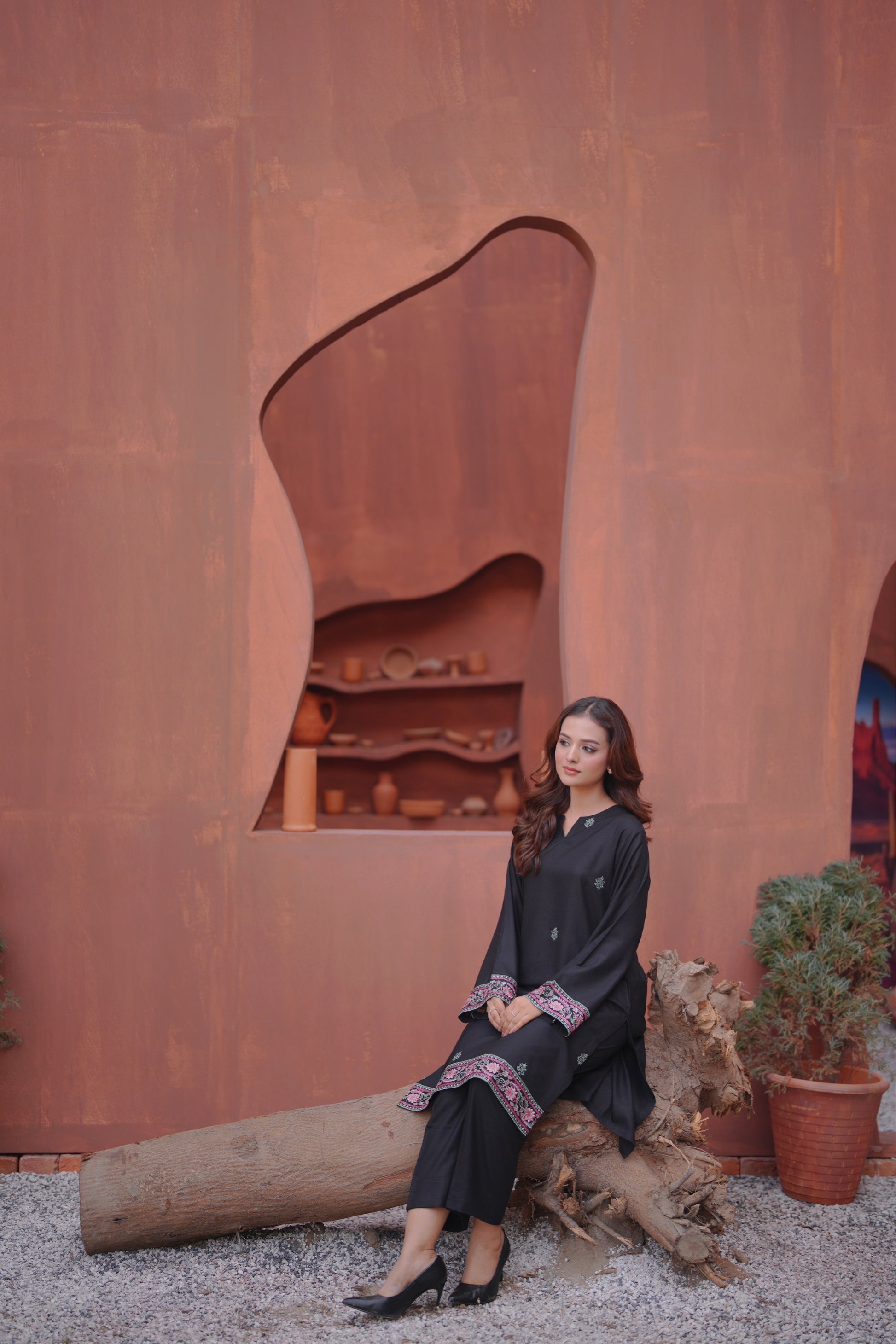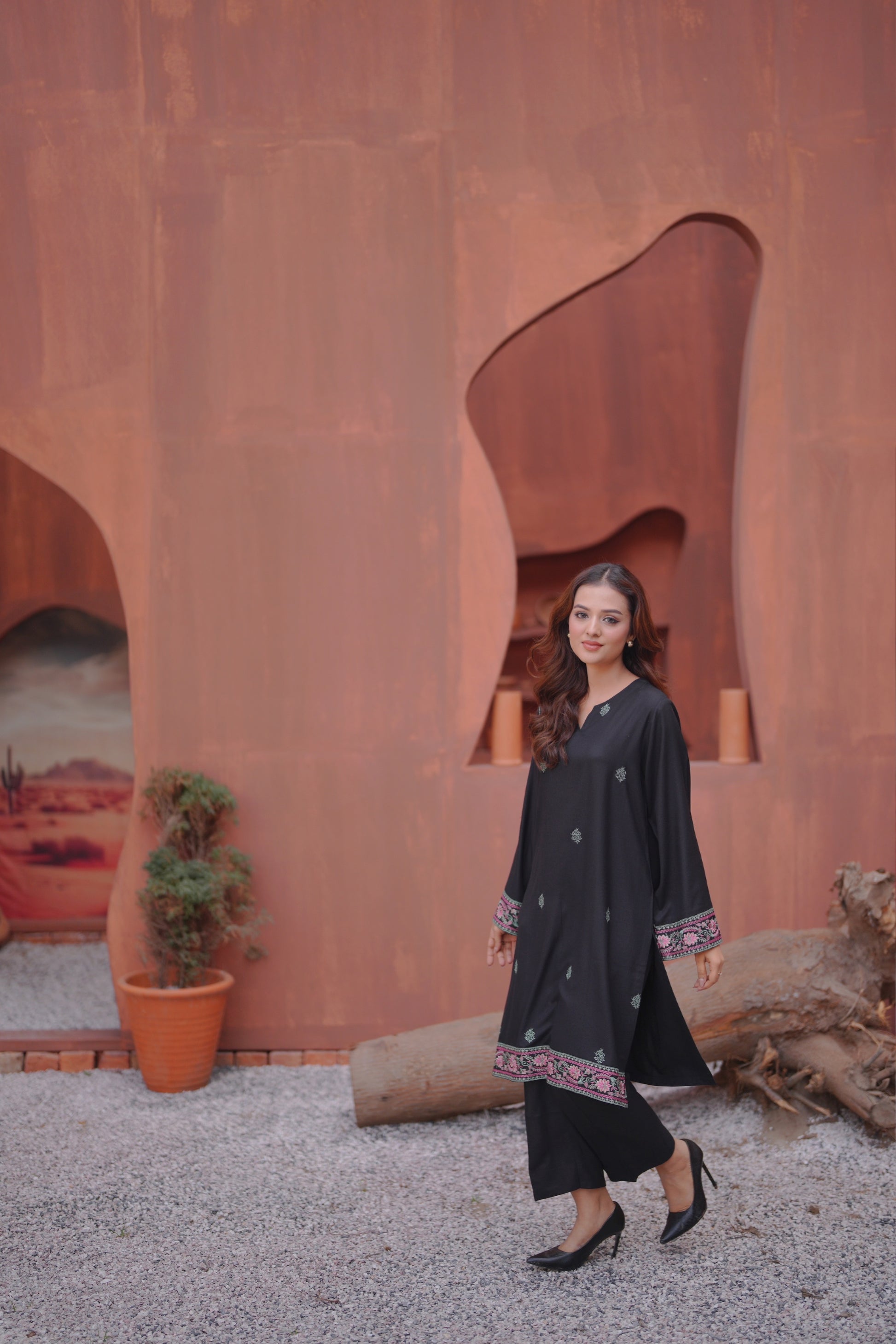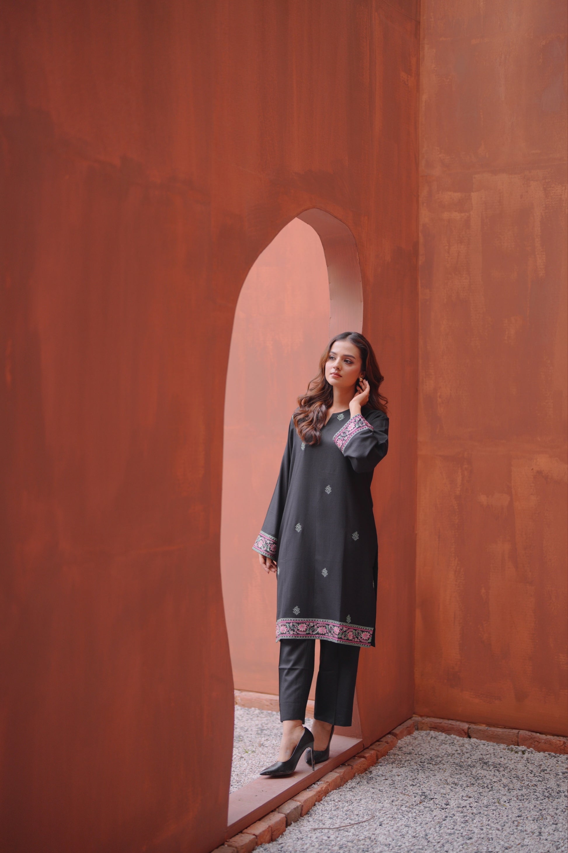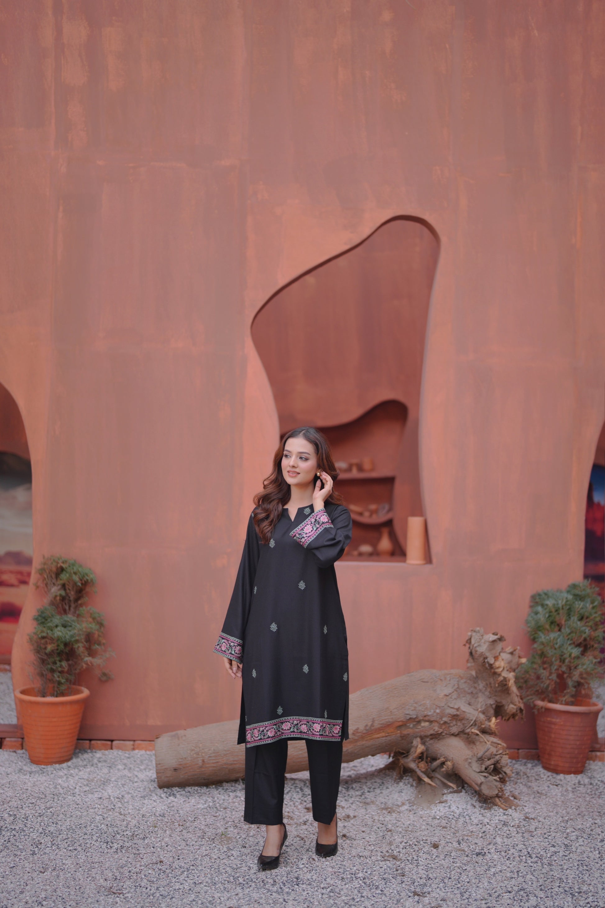 Enhance your look in a classy way with our embroidered black straight silhouette, paired with pants .